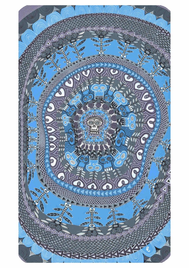 Comme dans tous mes mandalalas, j’ai ajouté ensuite les motifs en lien avec le thème abordé : d’autres têtes de mort, des ossements illustrant notre décrépitude, des plantes, des cœurs et des graines pour signifier le cycle de la vie, tout comme les incontournables flèches stylisées tantôt dans un sens, puis dans l’autre. Les sortes d’estampes japonaises, plus ou moins serrées les unes aux autres sont la représentation de la multitude infinie de pierres tombales sur lesquelles nos pas se posent constamment. Nous vivons tous sur un amoncellement de cadavres fait de nos semblables et de tous les êtres vivants qui nous ont précédé sur terre… l’idée me fait sourire, j’avoue.