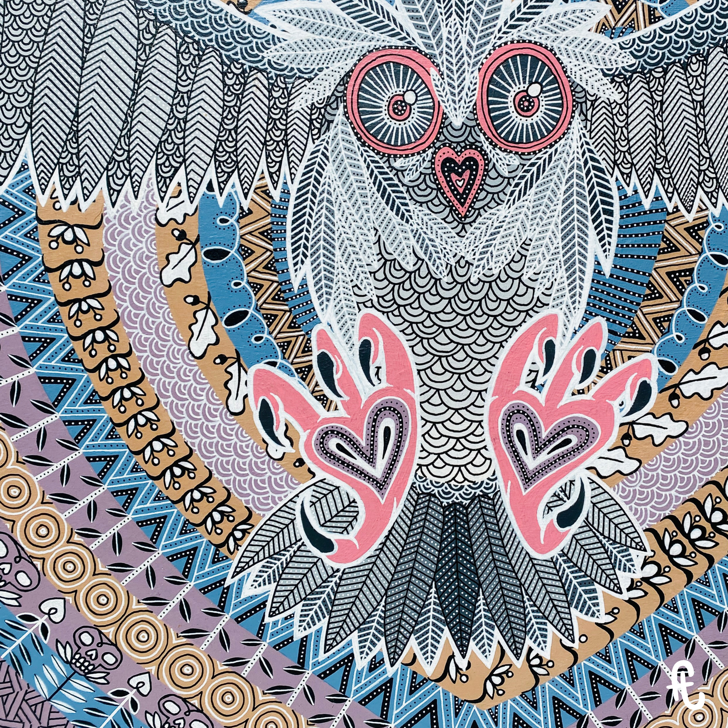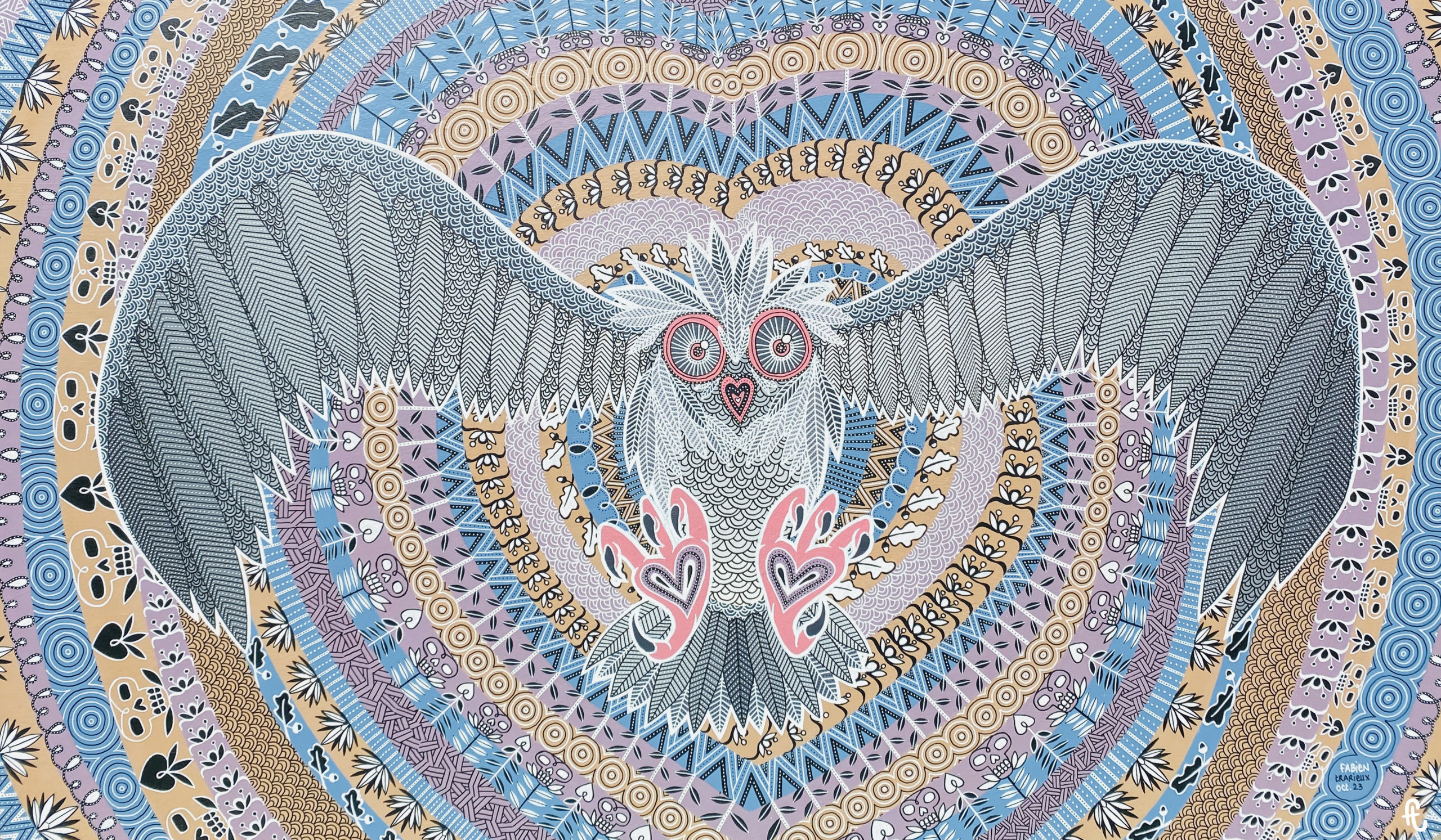 Cependant, je n’en étais pas encore entièrement satisfait comparé à ce que j’avais aperçu dans mon rêve. J’ai donc tenté une nouvelle approche en lui déployant ses ailes pour symboliser ainsi la fin (provisoire ?) des enfermements successifs, une liberté arrachée toutes griffes dehors. Comme un piaf, j’y ai laissé des plumes durant cette période funeste et historique. Mon cerveau tanguait dangereusement entre théories complotistes, colères envers nos gouvernants et sérieux doutes sur ma capacité à prendre du recul. La surcharge de motifs à l’intérieur des formes de la chouette ou des contours répétitifs sont une façon de conserver le côté anxiogène de cette période et les pensées en boucle, un loop(é) infini qui n’aurait de cesse que la fuite. Même si cette triste aventure collective est derrière nous, elle nous a rappelé la fragilité de notre système mondialisé, de nos infrastructures voire même tout simplement de nos vies. Leur donner la forme de cœurs vise à rendre hommage aux actes de solidarité dont de nombreux professionnels de santé, d’emplois liés au soin, à l’alimentaire, les livraisons, et de nombreux autres métiers sous-payés, ont su faire preuve. Pas moi, autant être honnête. Je ne parle pas non plus de ceux qui tapaient quotidiennement dans leurs foutues casseroles et à heures fixes.