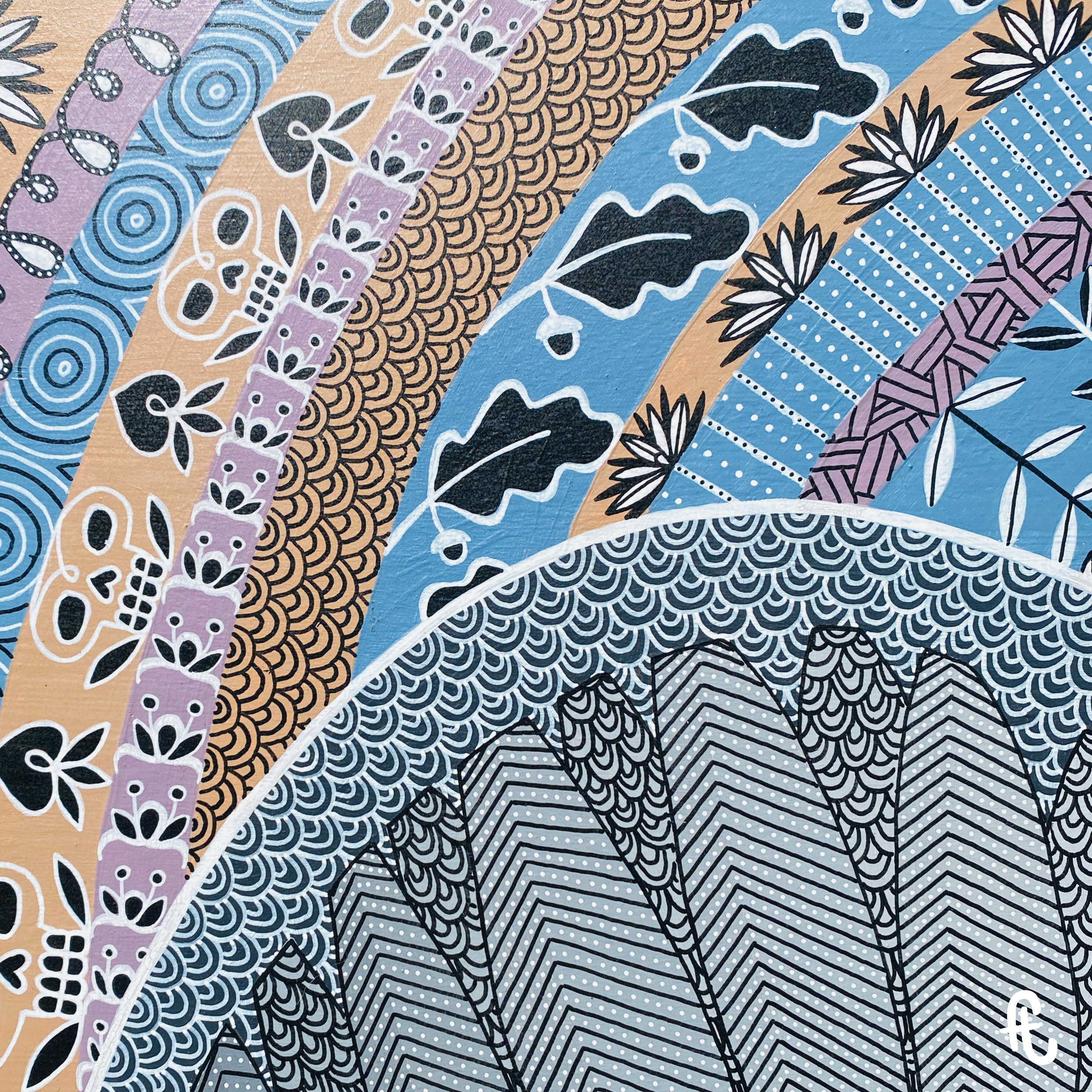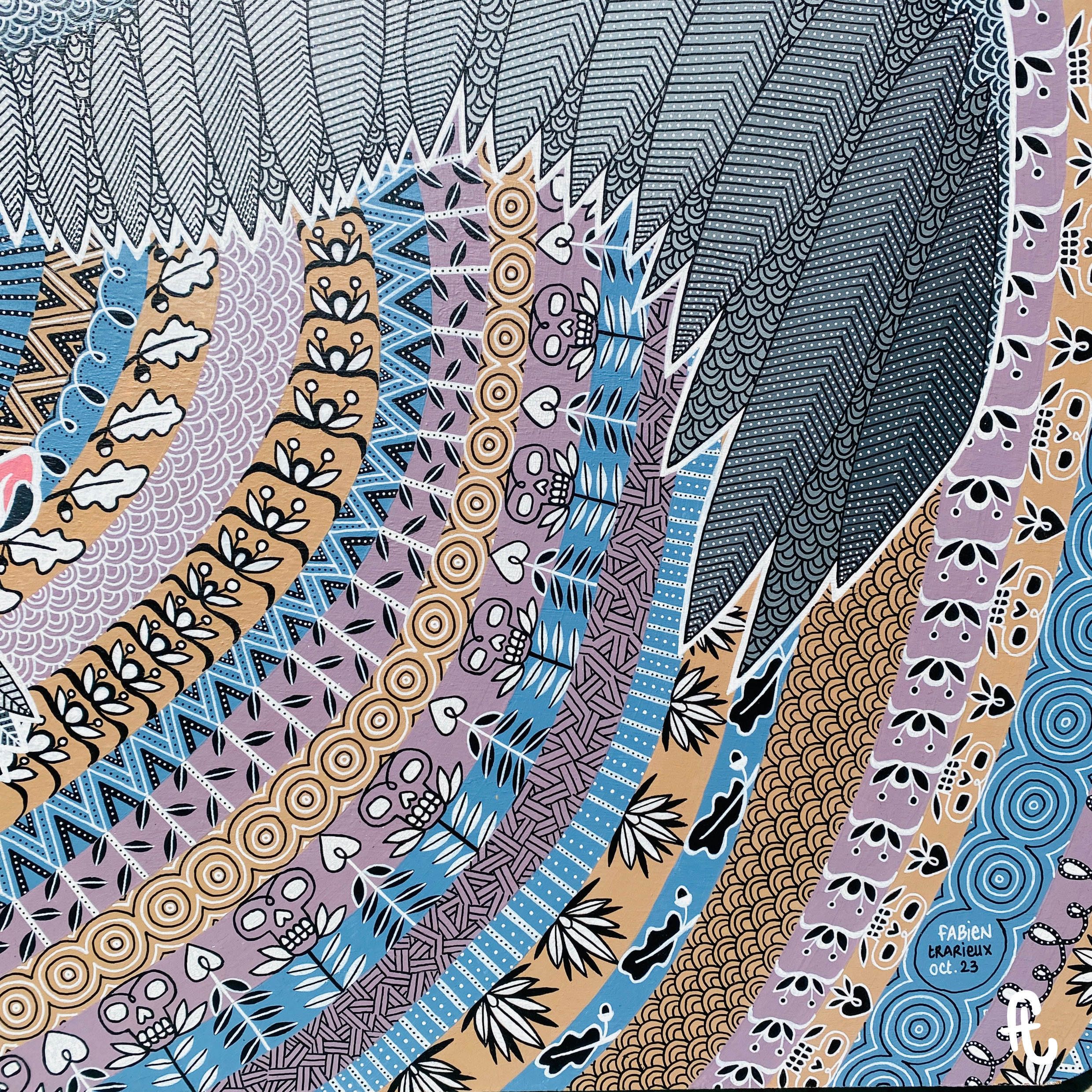 Vient ensuite l’intégration des motifs avec des feutres acryliques, toujours en lien avec le thème. Je n’en détaillerai pas ici leur signification. D’ailleurs certaines en ont, d’autres ont une fonction purement et simplement esthétique. Je tiens, par ailleurs, à laisser la liberté à chacun de les interpréter à sa guise.