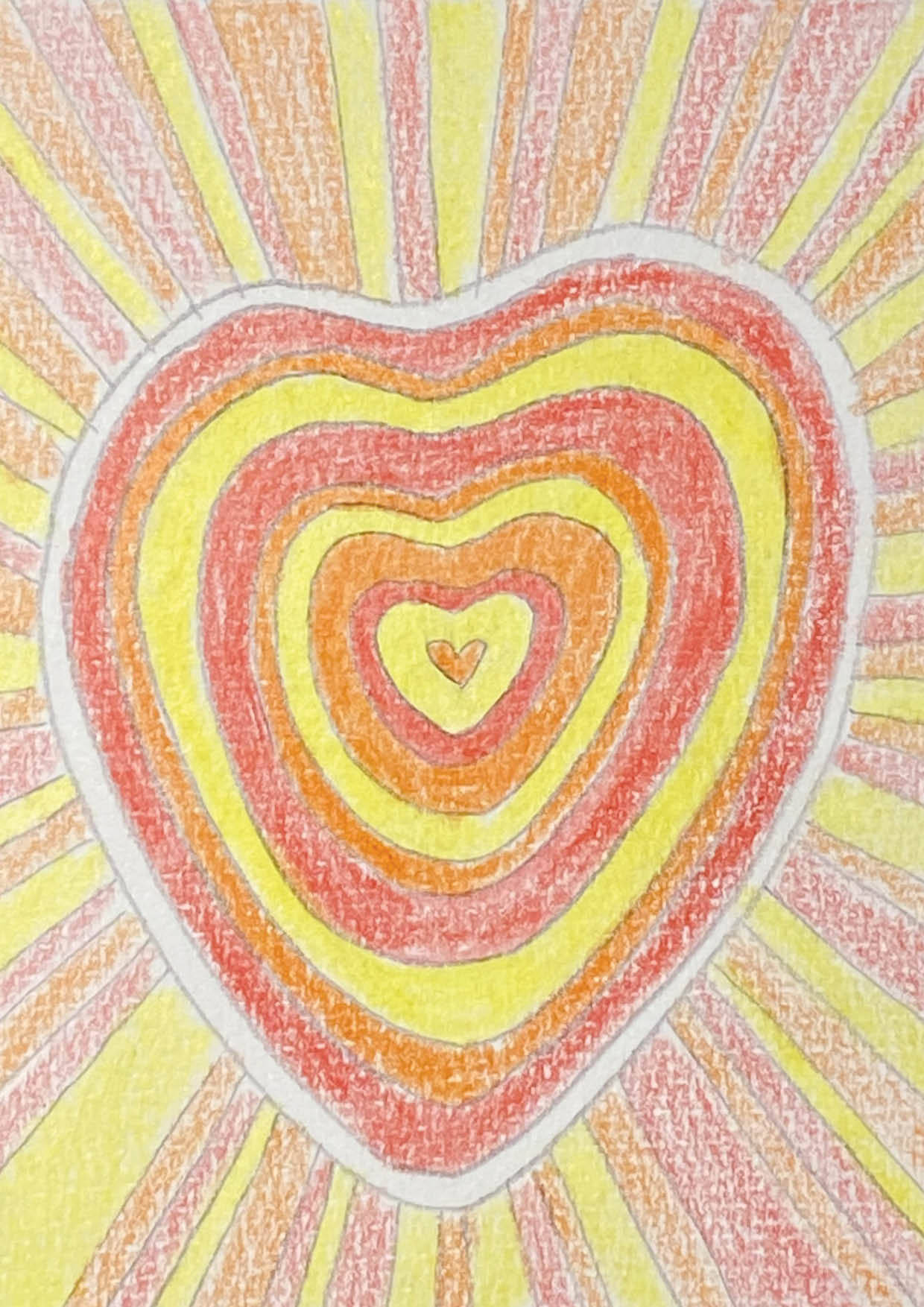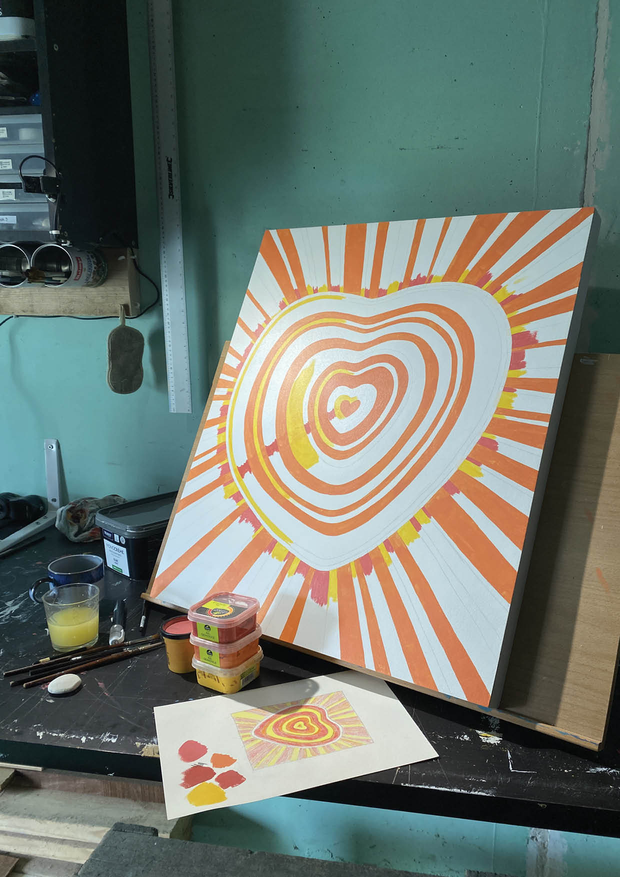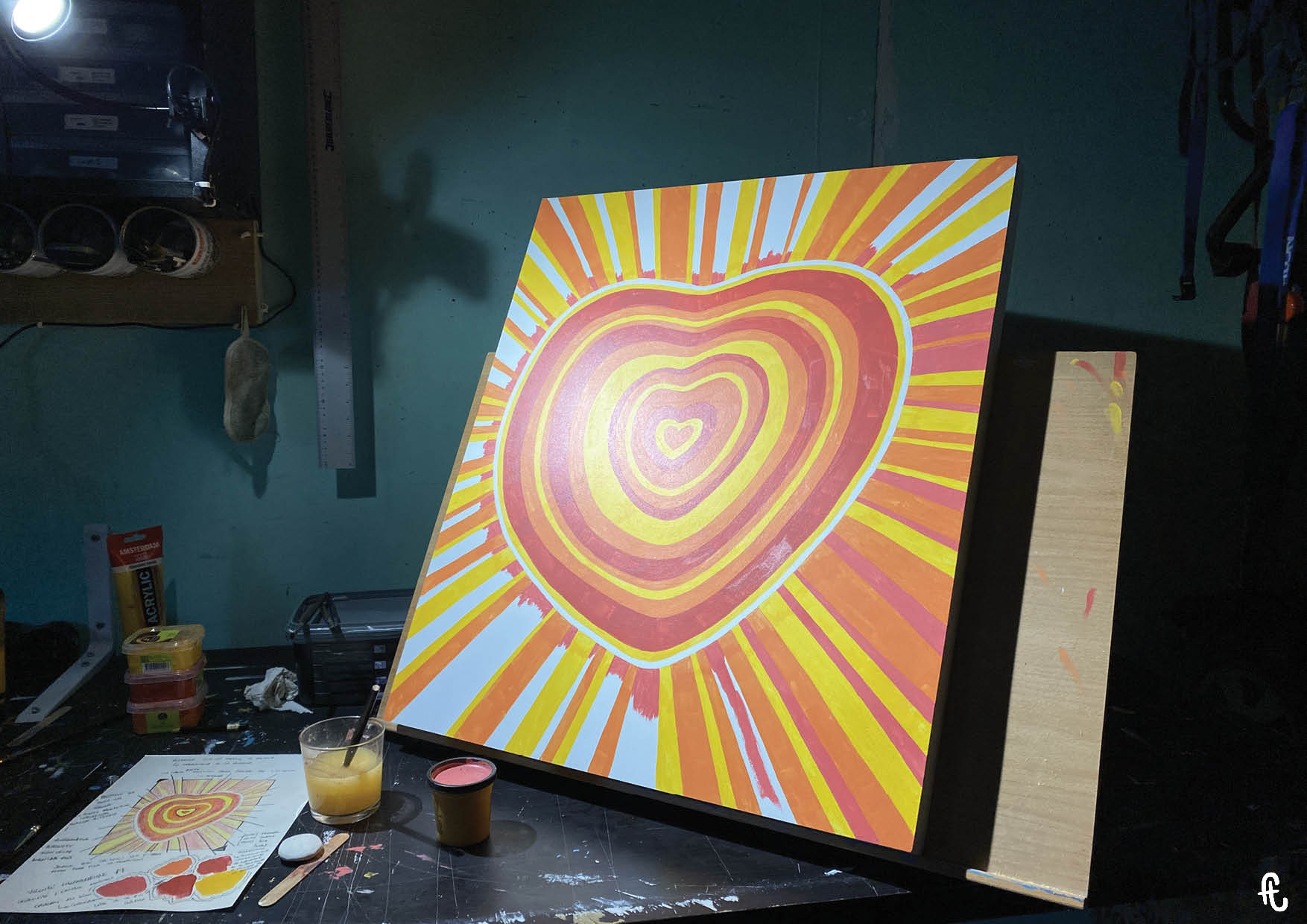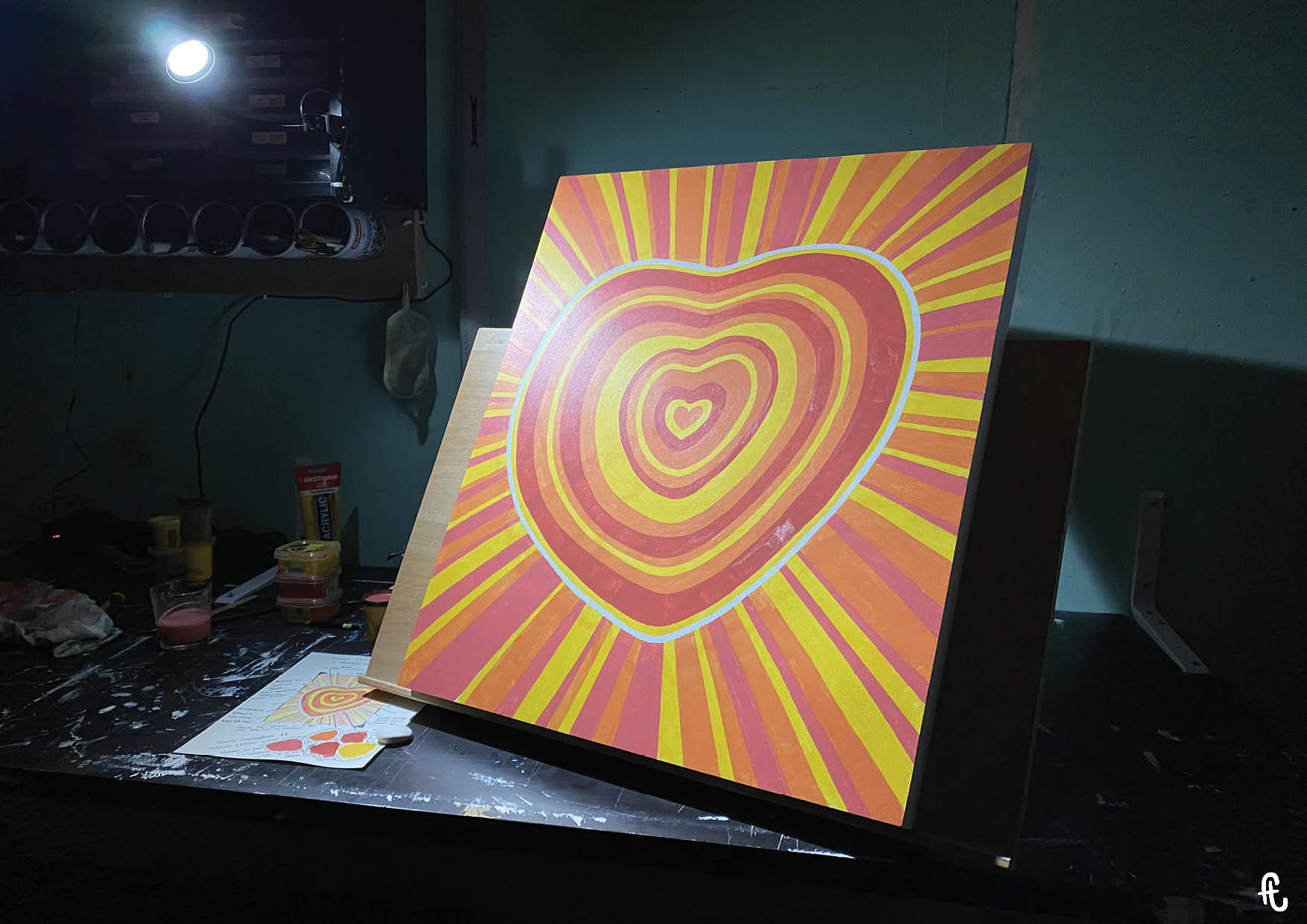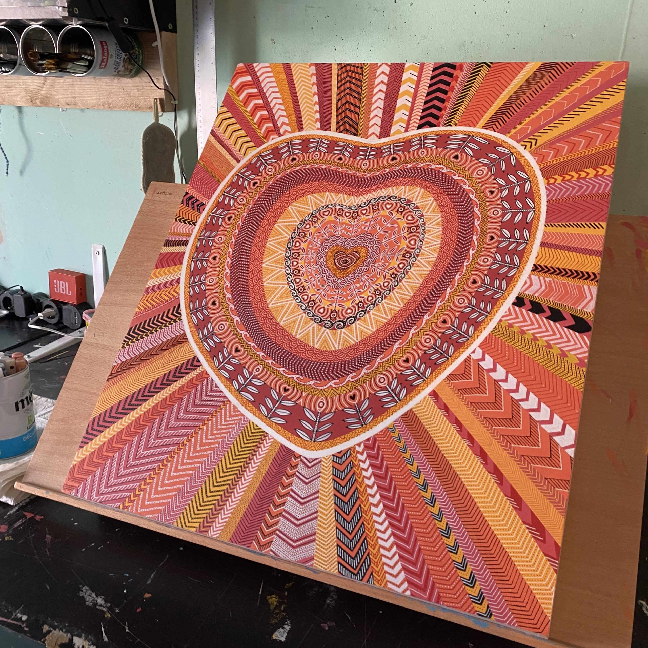 Le processus créatif m’a donc fait partir du tableau qu’elle avait choisi : DTC, « Dans Ton Cœur ». Pour symboliser l’amour d’une mère qu’elle porte à son enfant et la surveillance digne d’une dictature chinoise, j’ai repris le motif de l’œil plusieurs fois. Comme à mon habitude, j’ai créé le cadre, collé la surface en Isorel et peint trois couches d’apprêt pour donner un semblant de toile. Les tracés réalisés au crayon gris ont délimité les cernes du cœur pour ensuite placer les espaces où apparaîtront les motifs de flèches qui iront tous de l’intérieur vers l’extérieur. Symbole d’explosion, de libération et aussi purement esthétique (mais ce dernier point n’engage que moi), ils ne se répéteront jamais à l’identique. Tous ont des couleurs ou des formes différentes pour conter la multitude de nos évolutions, de nos libérations.