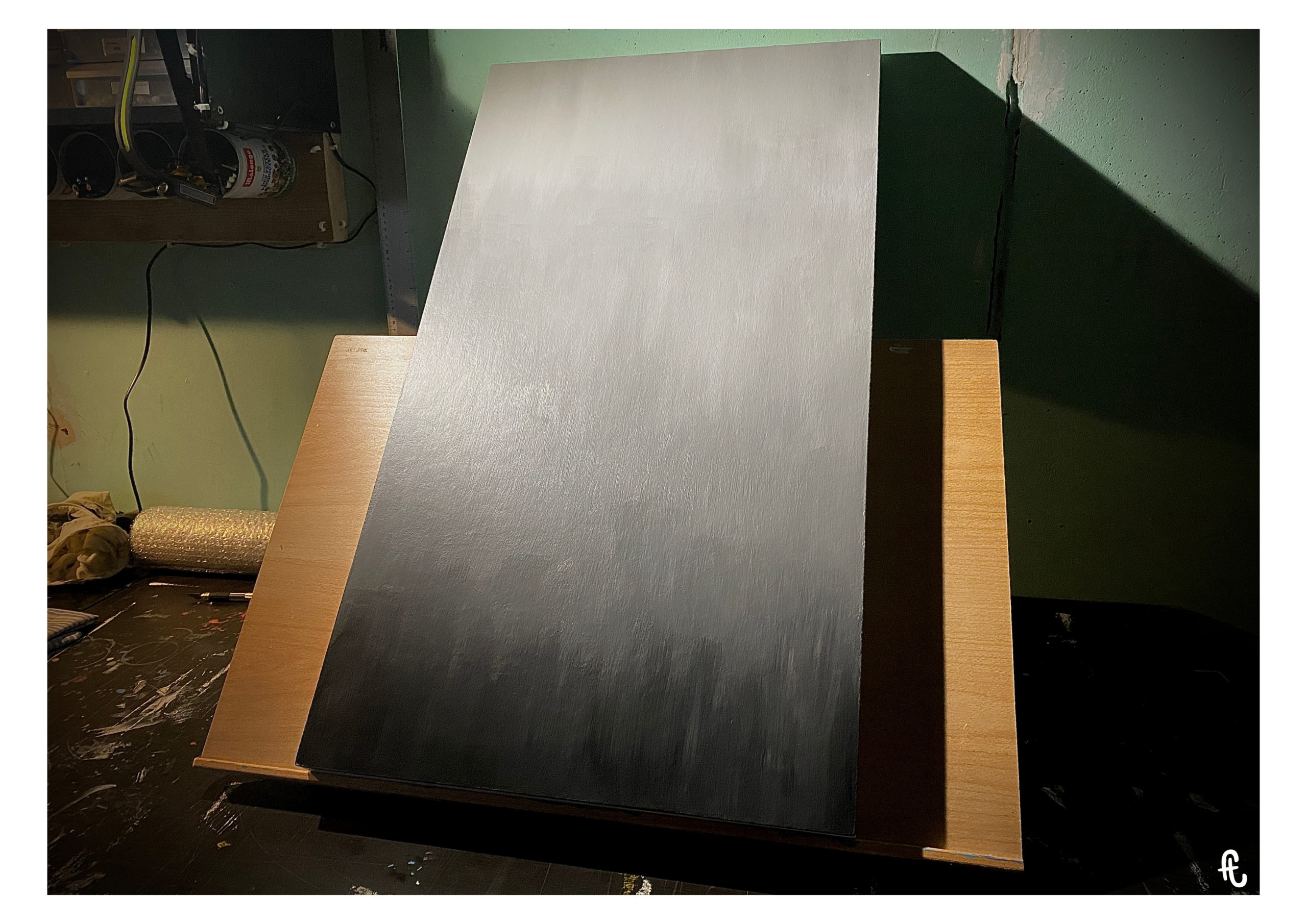 Une fois les tubes de couleurs reçus (et oui, pour moi le noir en est une, fin de la discussion, merci), j’ai pu réitérer le dégradé de l’enfer. Bam, réussi, non pas du premier coup, ni du deuxième, mais du troisième. Et puis franchement, je n’avais pas envie que le support finisse par peser plus lourd en peinture qu’en bois.