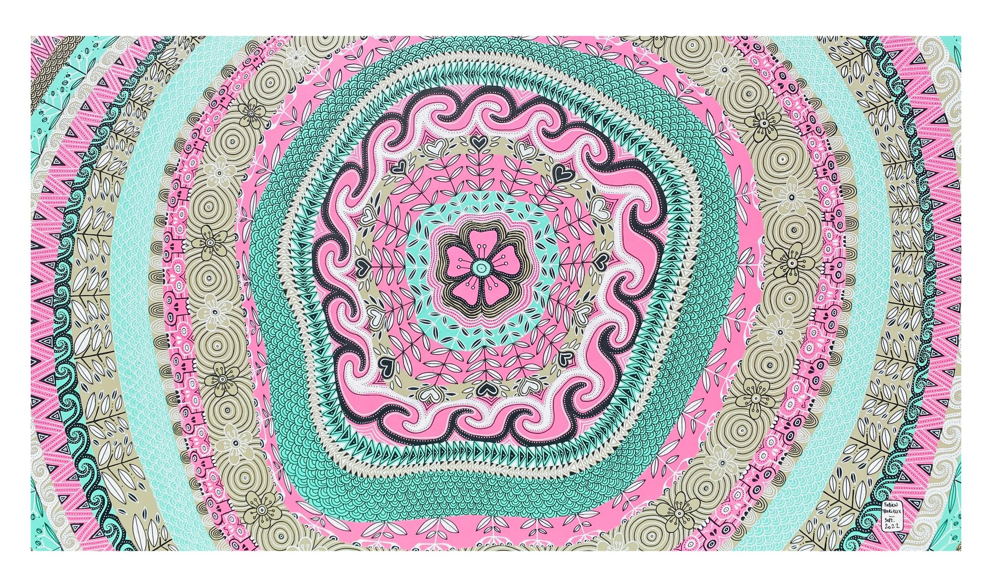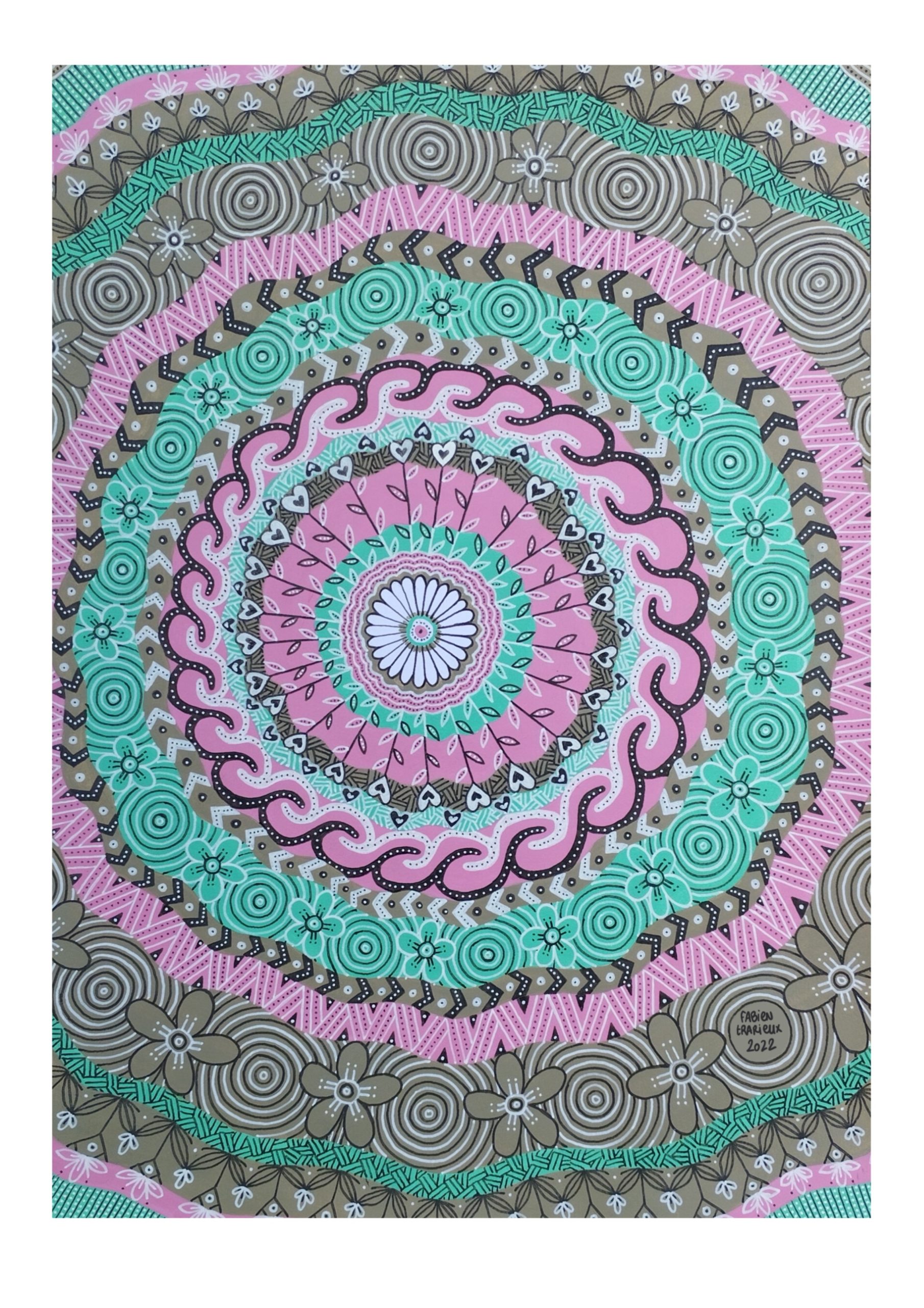 Pour « Flower Power », j’ai continué sur ma lancée de mandalalas en grand format. Tout comme « It’s always the sun », je n’avais pas d’objectif déterminé quant aux intentions de ce tableau. Si ce n’est de tenter d’assembler de belles couleurs autour d’une fleur stylisée dans son plus simple appareil, entourée de son contour concentrique. Les couleurs de ces cernes, qui rappellent celles du bois, s’alternent entre le rose, le vert et le marron dont les motifs internes jouent sur leurs teintes qui foncent ou s’éclaircissent en fonction de la couleur du feutre acrylique utilisé.