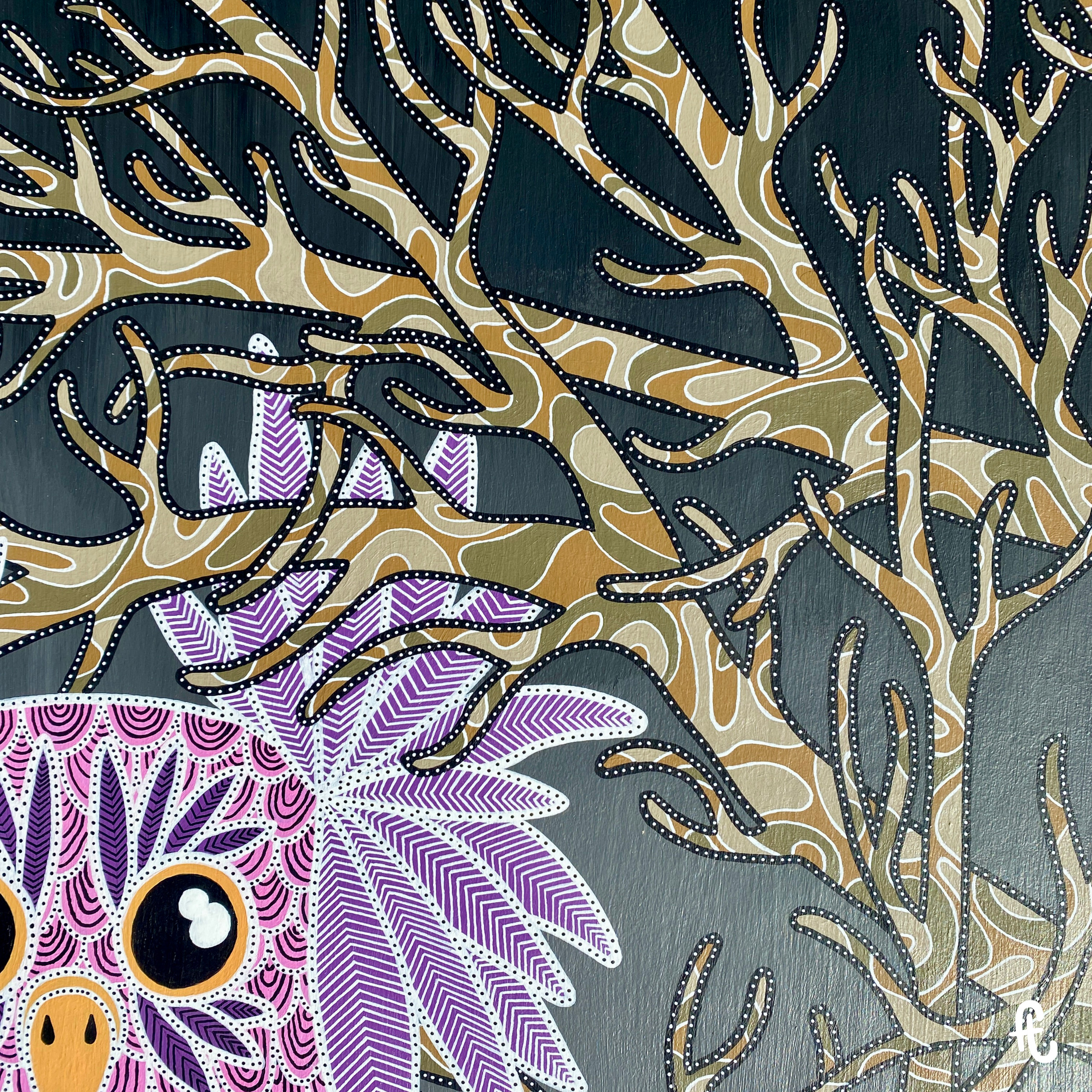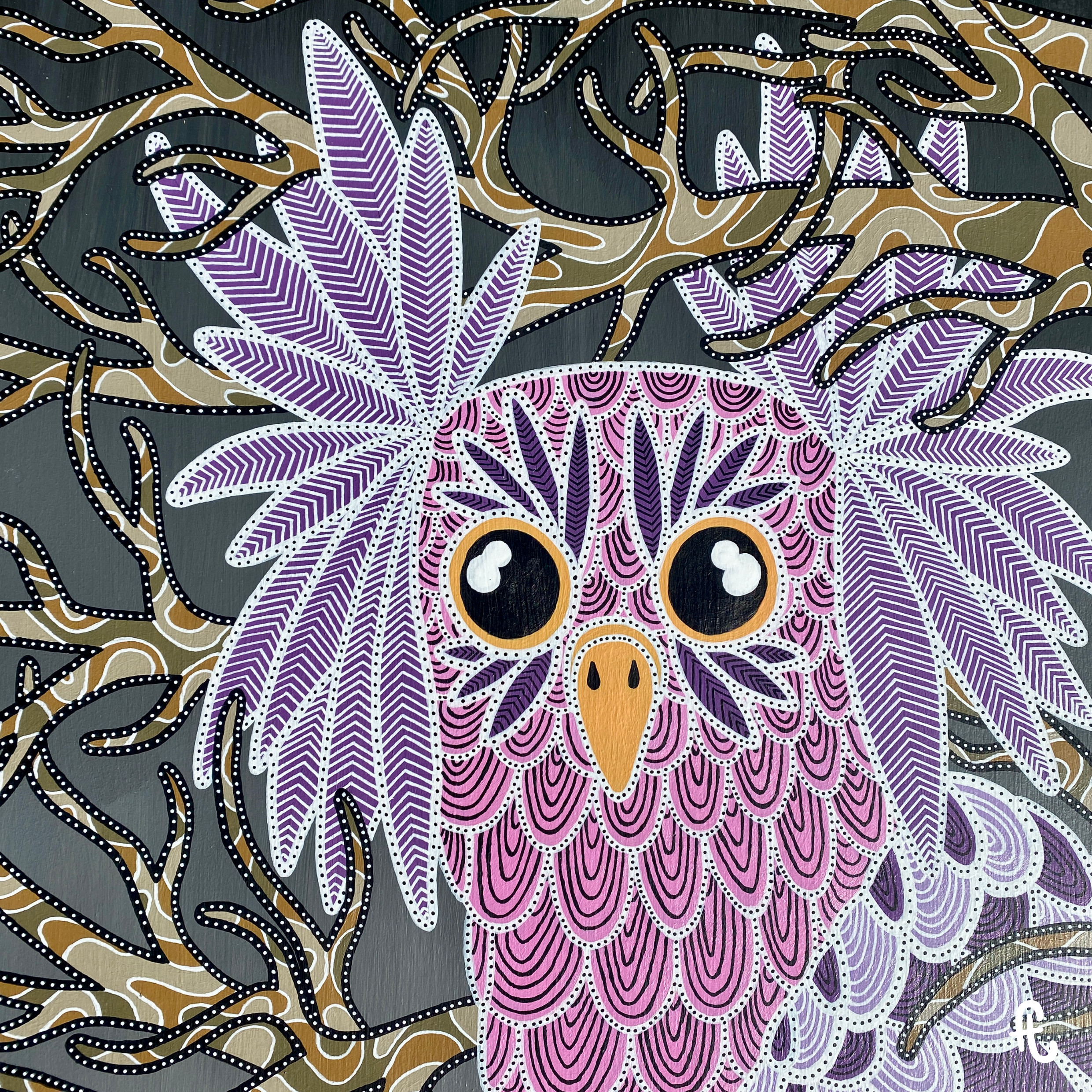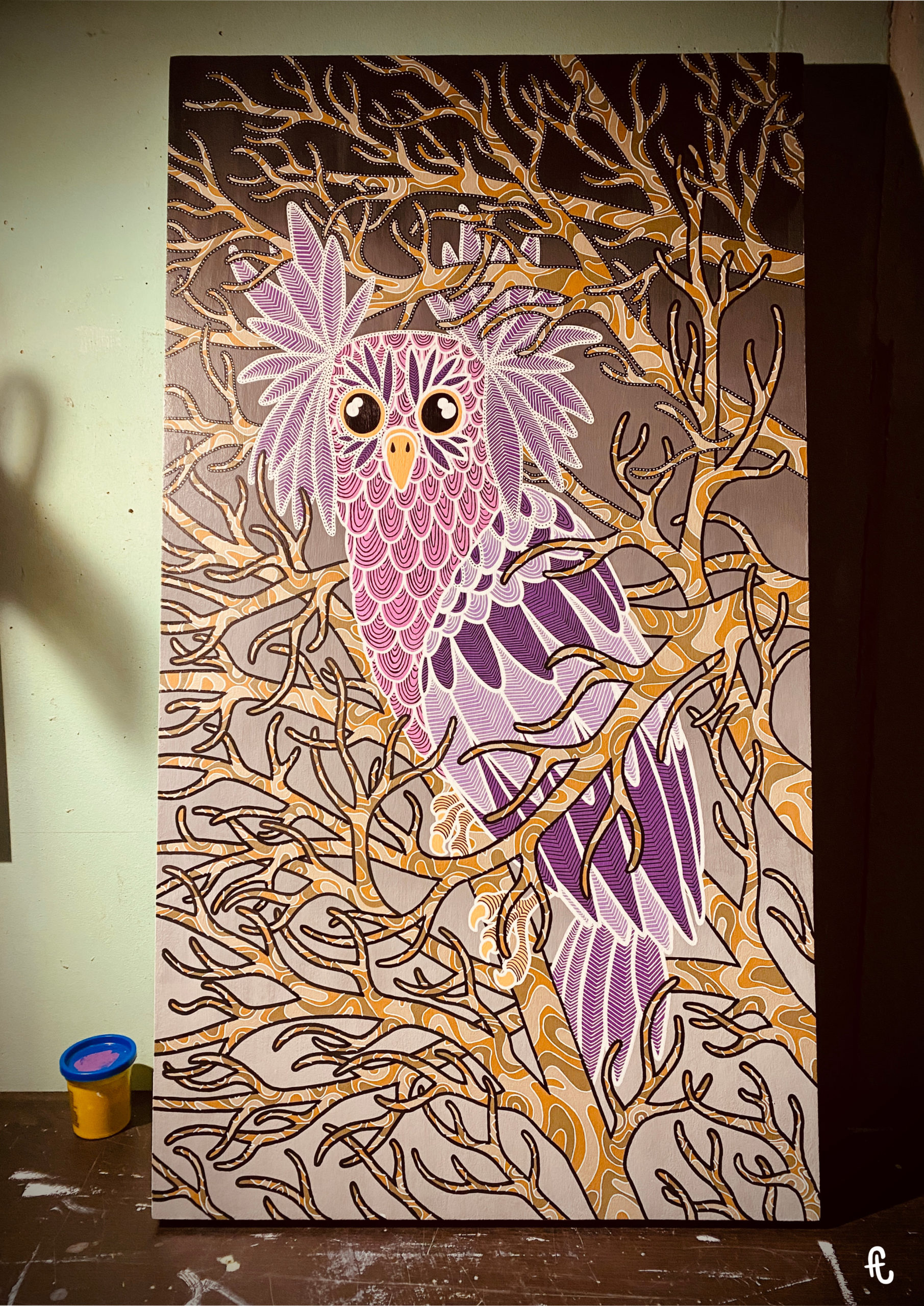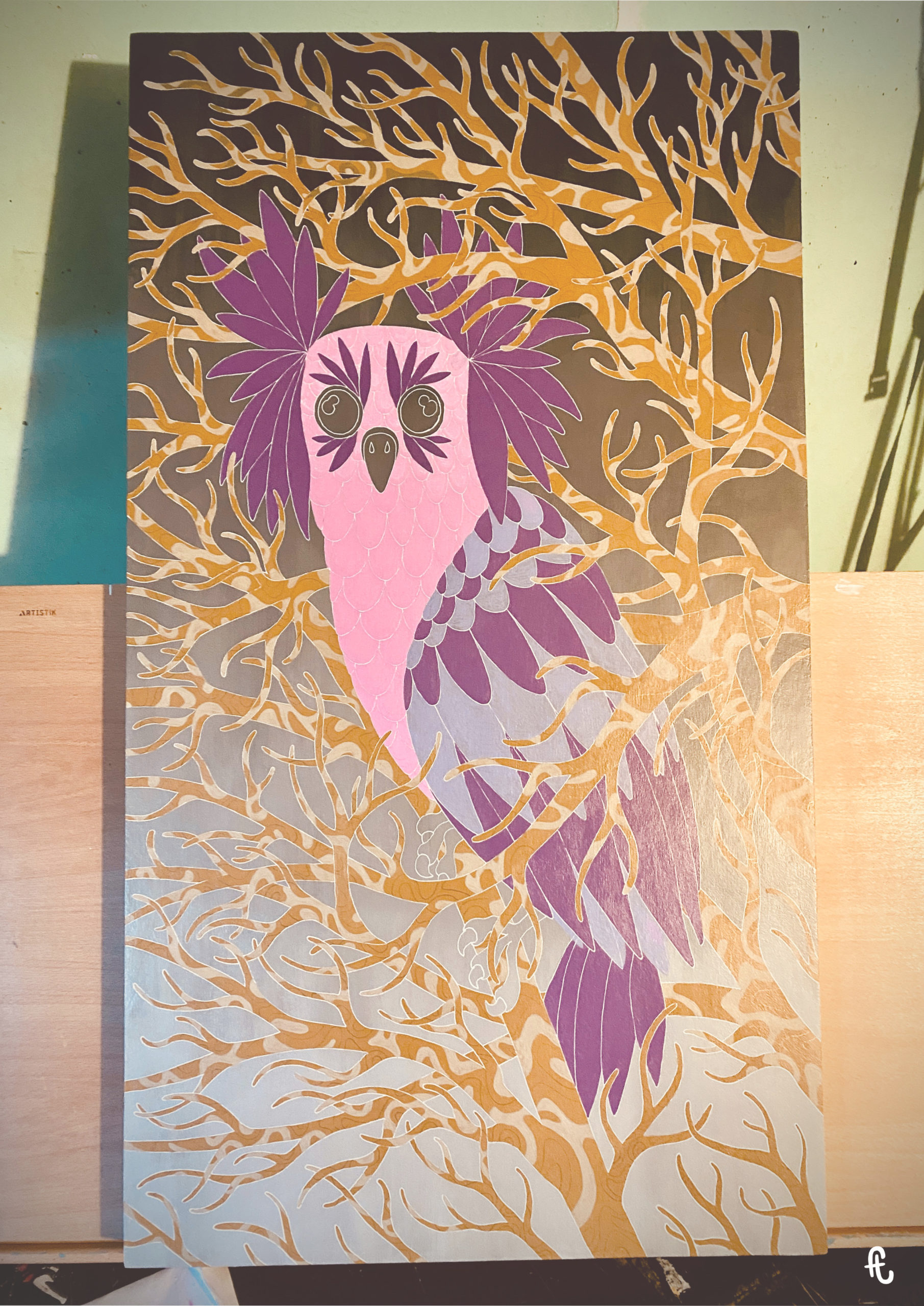 L’idée : continuer sur ma lancée des chouettes/hiboux, m’éloigner des mandalalas, jouer sur le dégradé en fond et intégrer des branches d’arbre. Sans doute du fait de ce rêve, de mon attachement aux arbres, et de la volonté d’intégrer le monde animal dans mon travail. Peut-être aussi en écho à l’époque anxiogène que nous traversons et à l’environnement que nous grignotons un peu plus chaque jour.