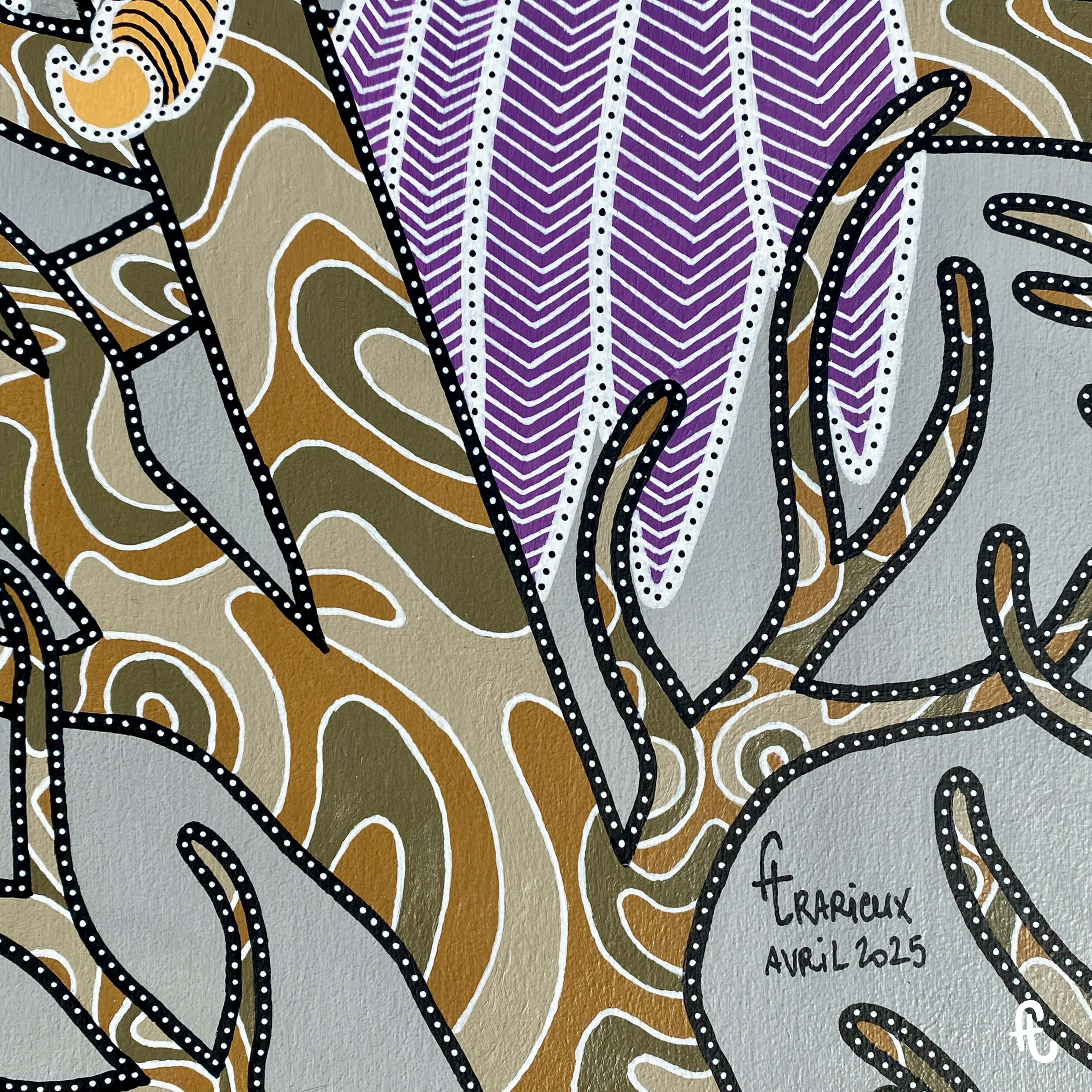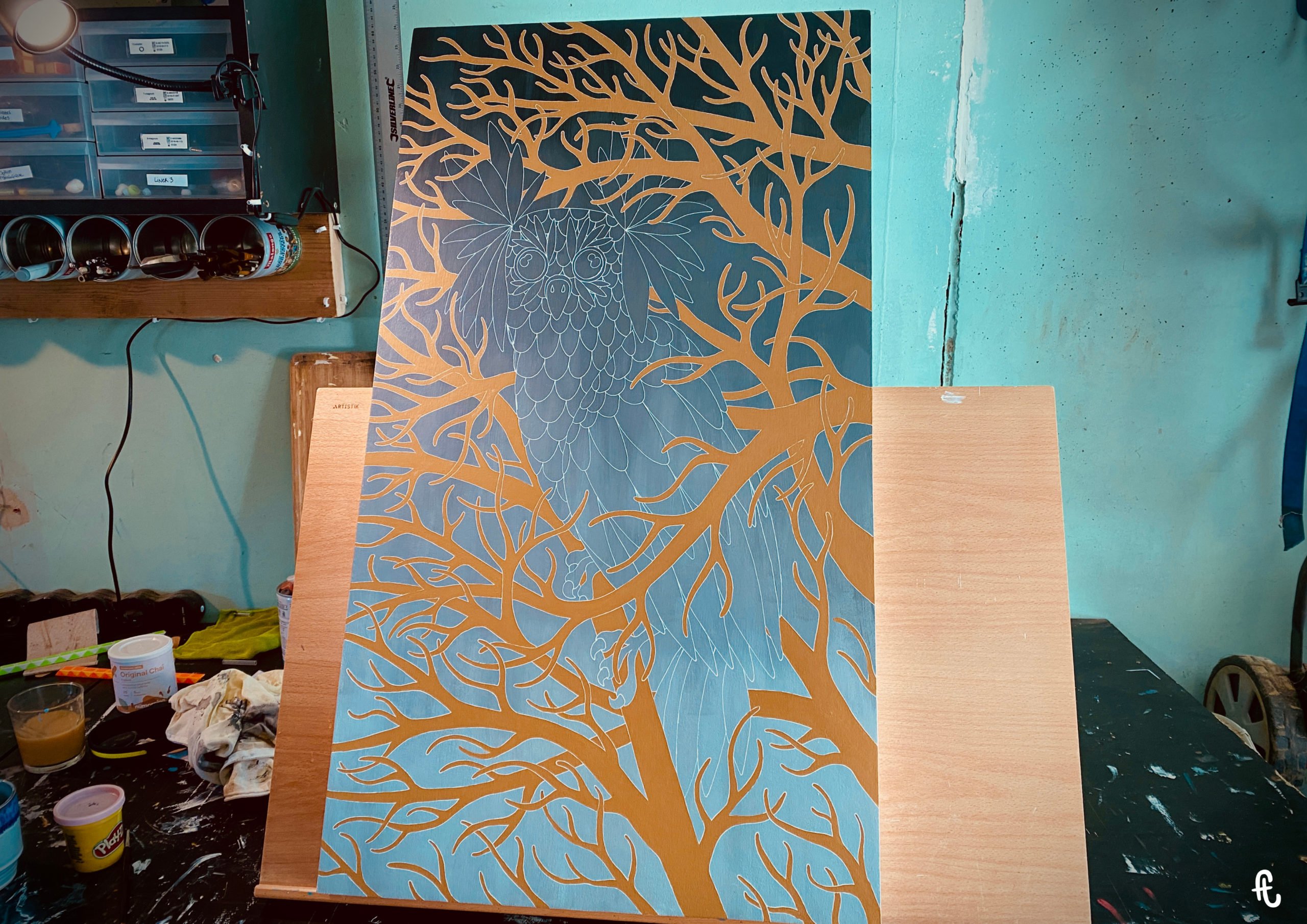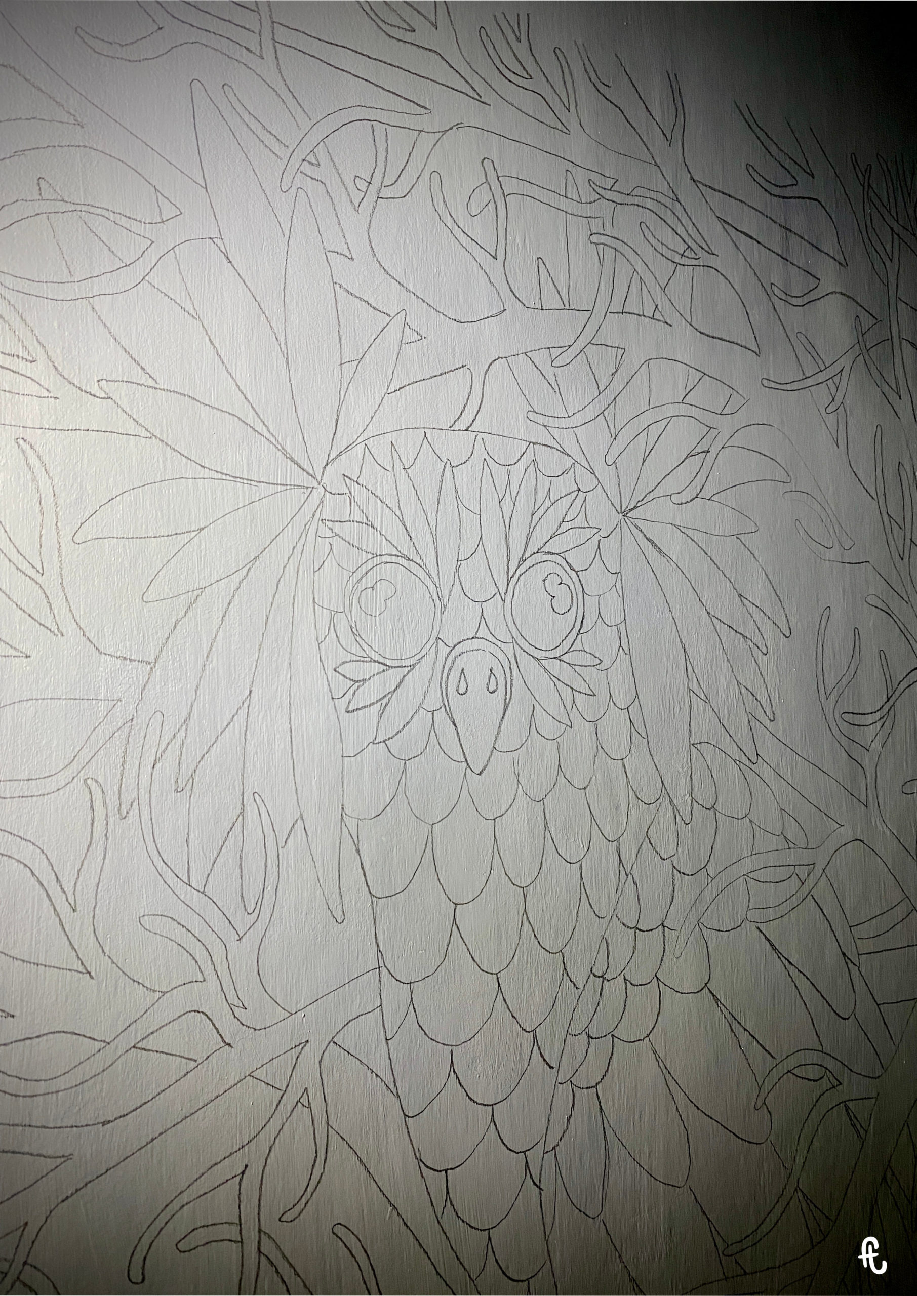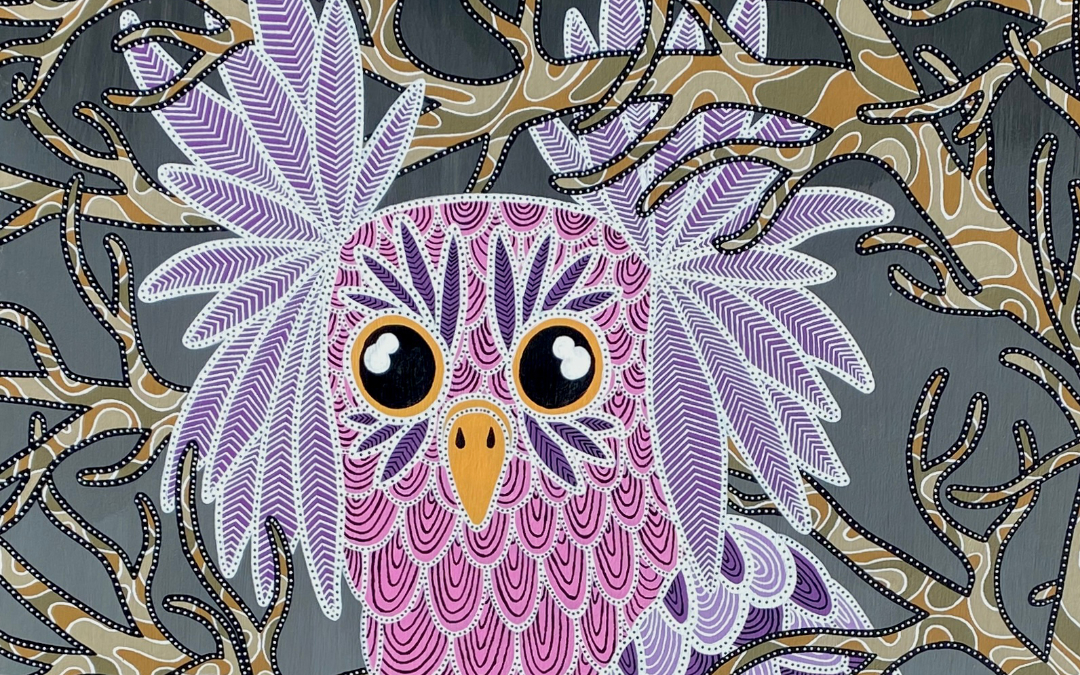 L’idée : continuer sur ma lancée des chouettes/hiboux, m’éloigner des mandalalas, jouer sur le dégradé en fond et intégrer des branches d’arbre. Sans doute du fait de ce rêve, de mon attachement aux arbres, et de la volonté d’intégrer le monde animal dans mon travail. Peut-être aussi en écho à l’époque anxiogène que nous traversons et à l’environnement que nous grignotons un peu plus chaque jour.