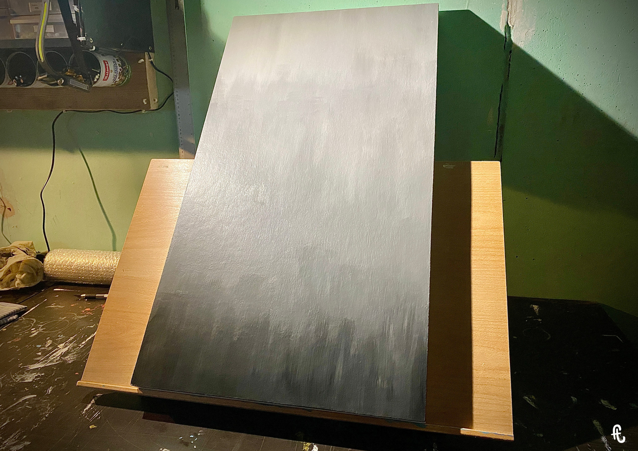 Il me faut donc accepter de n’avoir aucune idée précise de mes intentions artistiques. Sinon celle de sortir de ma zone de confort, explorer un style, des couleurs et des techniques différentes. Malgré le froid humide de l’atelier, les dégradés ratés, les phases dépressives, ce tableau remporte la palme du temps passé sur une œuvre.