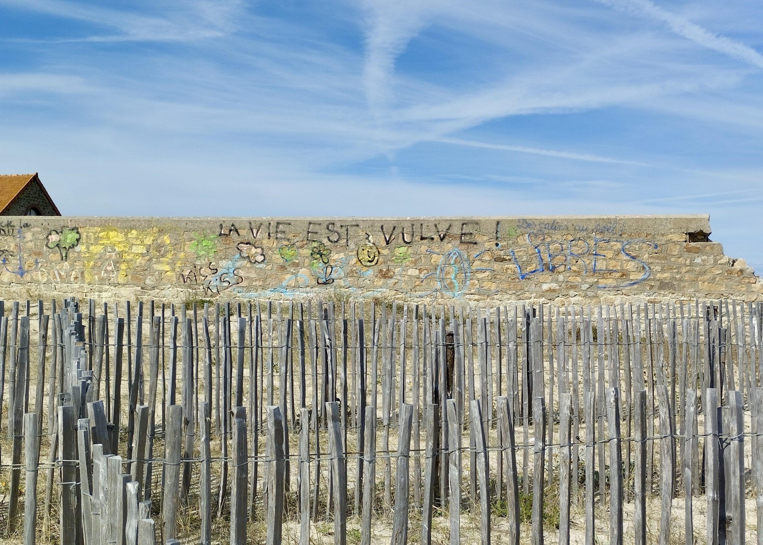 Plusieurs enjeux pour ce tableau « La vie est vulve ». Le titre s’était imposé à moi comme une évidence lorsque je suis tombé face à ce tag, légèrement délavé depuis, mais toujours visible, au bord de la grande plage de la presqu’île de Gâvres.