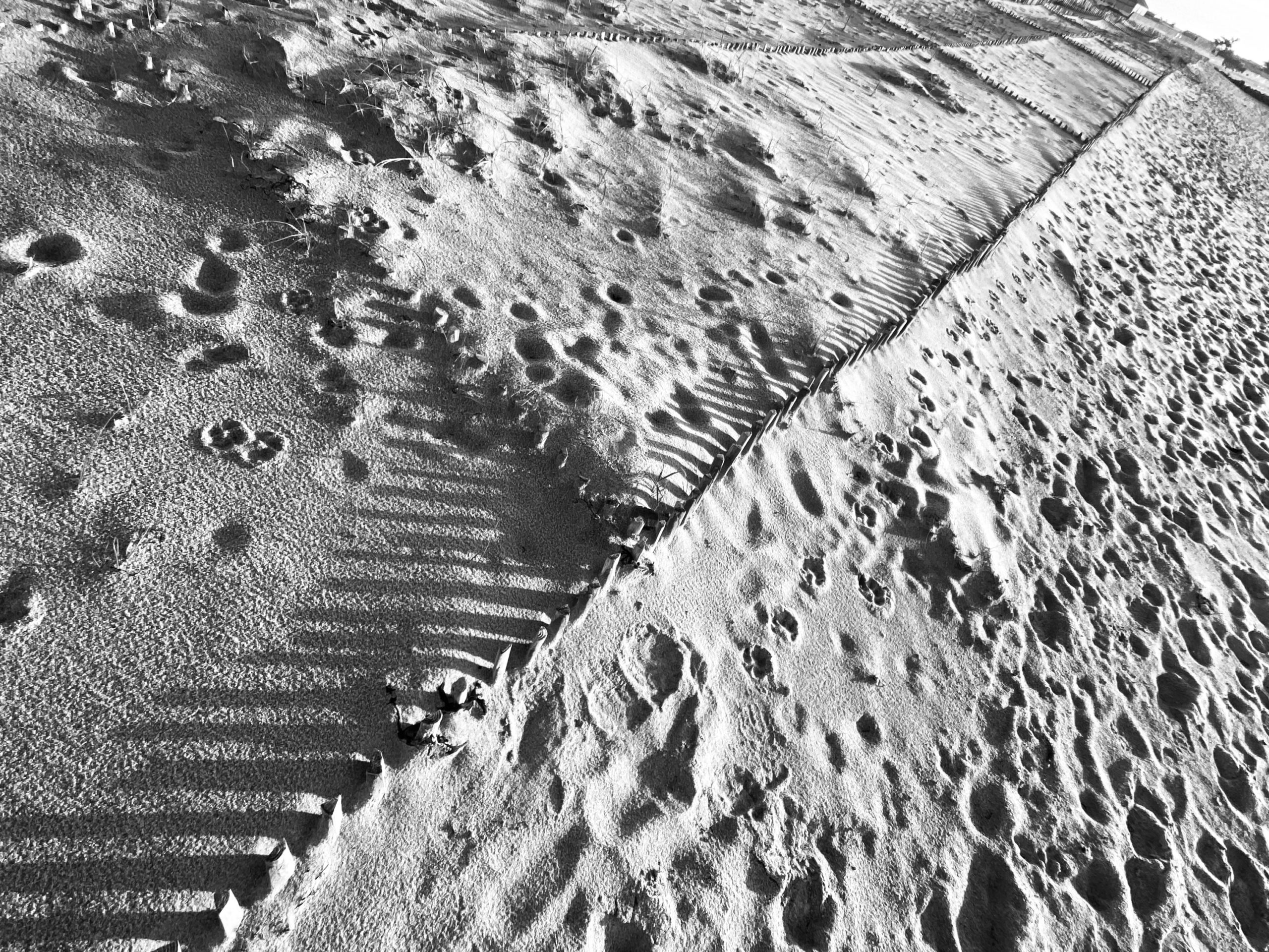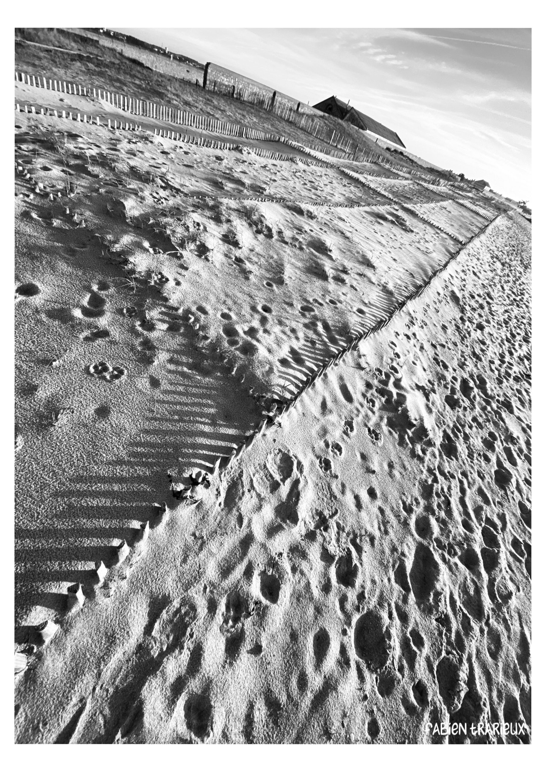 Sable et ganivelles paysage sous froid noir et blanc hivernal