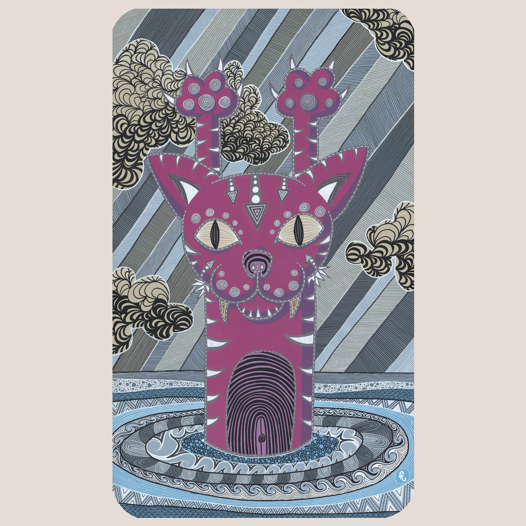 Le pelage rose du chat n’est pas un choix de douceur, mais un outil de contraste saisissant. Je voulais souligner le décalage entre la perception apaisante de cette couleur et la situation périlleuse, presque irréelle, dans laquelle se trouve l’animal. Tandis que des bandes obliques marrons, grises et bleues strient le ciel pour évoquer une pluie incessante, le rose souligne la fragilité de la vie face aux éléments. C’est une métaphore de la réalité vécue pendant la pandémie : une situation gérable en surface, mais dissimulant des tourments bien plus profonds.