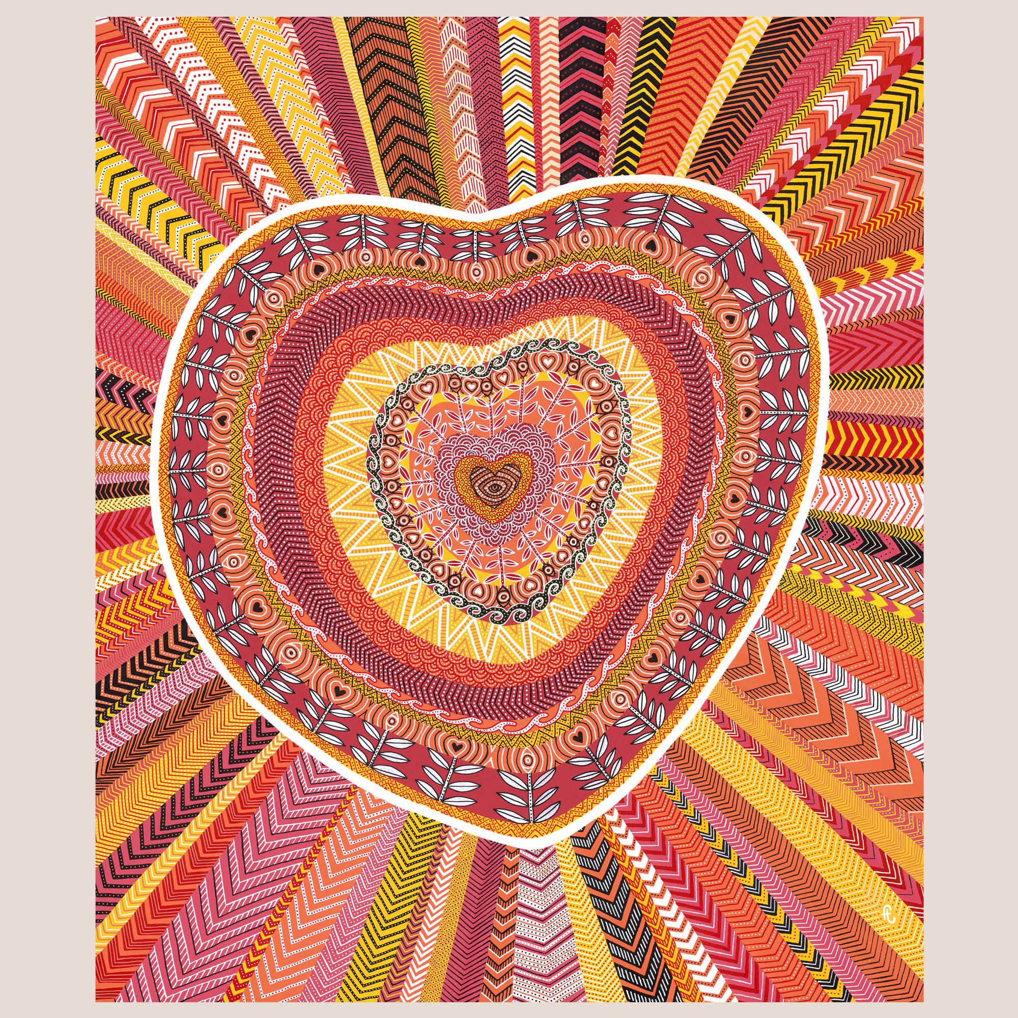 Techniquement, j’ai repris le motif de l’œil plusieurs fois pour symboliser cette présence constante. Autour de ce centre névralgique, j’ai tracé des cernes de cœur peuplés de flèches. Ces flèches pointent toutes vers l’extérieur : elles sont le symbole de l’explosion, de la libération et de nos évolutions respectives. Aucune ne se répète à l’identique, car chaque étape de notre vie, chaque pas vers l’émancipation, possède sa propre couleur et sa propre forme.