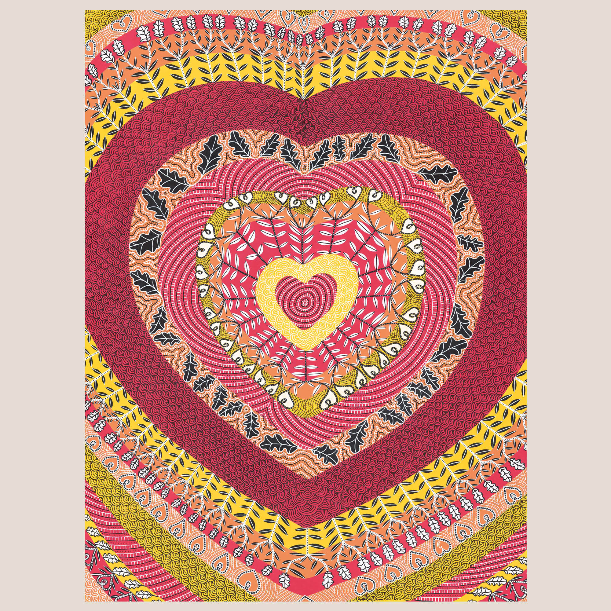 Contrairement au modèle initial, j’ai choisi ici d’arrondir les cernes des cœurs pour rendre le motif central plus doux et apaisant. J’en avais un besoin viscéral. Sa conception s’est faite dans une ambiance nationale nauséabonde, entre crises politiques et relents de haine. Face à l’incompréhension devant l’étroitesse intellectuelle et le rejet de l’autre, ce tableau est devenu mon refuge. Je ne voulais pas m’enfermer dans la haine en retour, mais plutôt opposer une barrière de couleurs à la morosité ambiante pour protéger mon esprit et celui de mes proches.