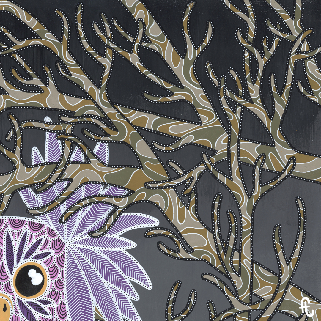 Cette reproduction d’art d’exception est le fruit d’une exploration onirique persistante sur le thème du volatile mystérieux. L’artiste met en scène une créature hybride entre chouette et hibou, baignée dans des nuances de mauve et de violet. Le sujet se détache d’un arrière-plan complexe composé de branches d’arbres aux motifs inspirés de l’écorce des platanes. Un dégradé de fond méticuleux apporte une atmosphère de sous-bois nocturne et protecteur à l’ensemble. Les détails graphiques, réalisés avec une précision chirurgicale, soulignent l’anatomie fantastique de cet animal totem irréel. Cette œuvre marque une rupture avec les compositions circulaires habituelles pour embrasser un style plus figuratif et organique. Elle témoigne d’une recherche technique intense sur les contrastes entre aplats de couleurs et traits de feutre acrylique. Ce tirage limité invite à la contemplation d’un monde naturel réinventé où le rêve rencontre la matière. Une pièce mémorable qui capture la fascination de l’artiste pour la faune et la flore.