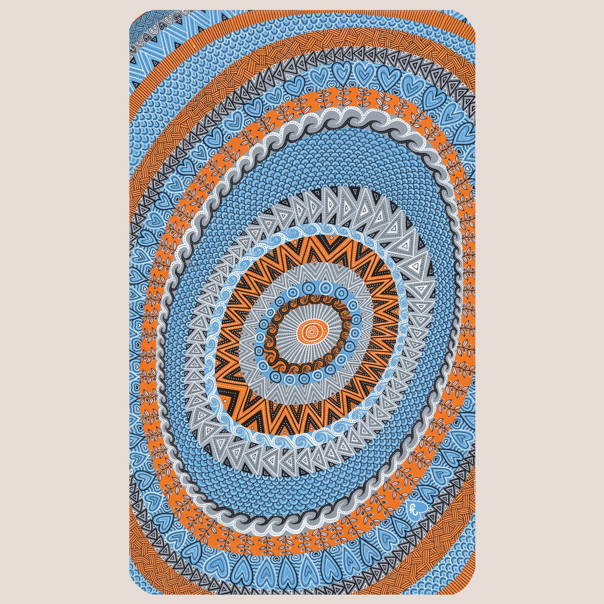 Le processus est resté fidèle à ma méthode : un tracé au crayon gris à main levée suivi d’une répartition intuitive des teintes. J’y ai intégré mes thèmes de prédilection, reproduits à l’infini : les vagues pour l’eau, les rayons pour le soleil, des estampes japonaises stylisées pour la terre. On y retrouve aussi des cœurs pour nos interdépendances et des flèches symbolisant le cycle éternel de la vie. Quant à mon talent de devin… j’ai intitulé l’œuvre ainsi avant que les étés bretons ne deviennent pluvieux, preuve que l’art est parfois plus optimiste que la météo !