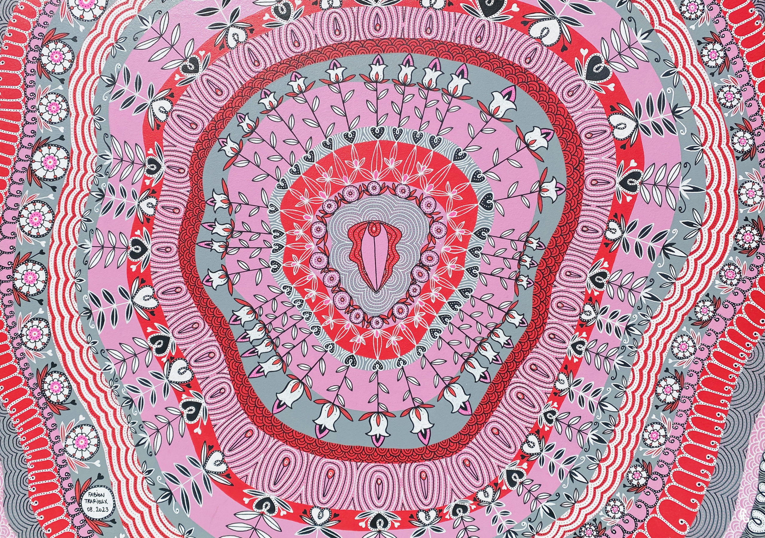 « La Vie Est Vulve » part d’une vulve stylisée centrale d’où s’étendent des formes concentriques. Les aplats de ces contours sont réalisés au pinceau et à la peinture acrylique.